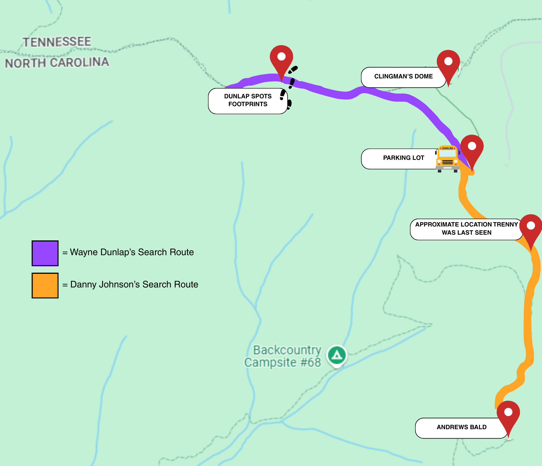 Remember, Simpson had spent the majority of the day with Trenny, before she suddenly left him behind to speed walk to the bus, and he was also the last person down the trail. Simpson told his story about staying behind to track the bear, and claimed he never saw Trenny after she left him up at Andrews Bald.