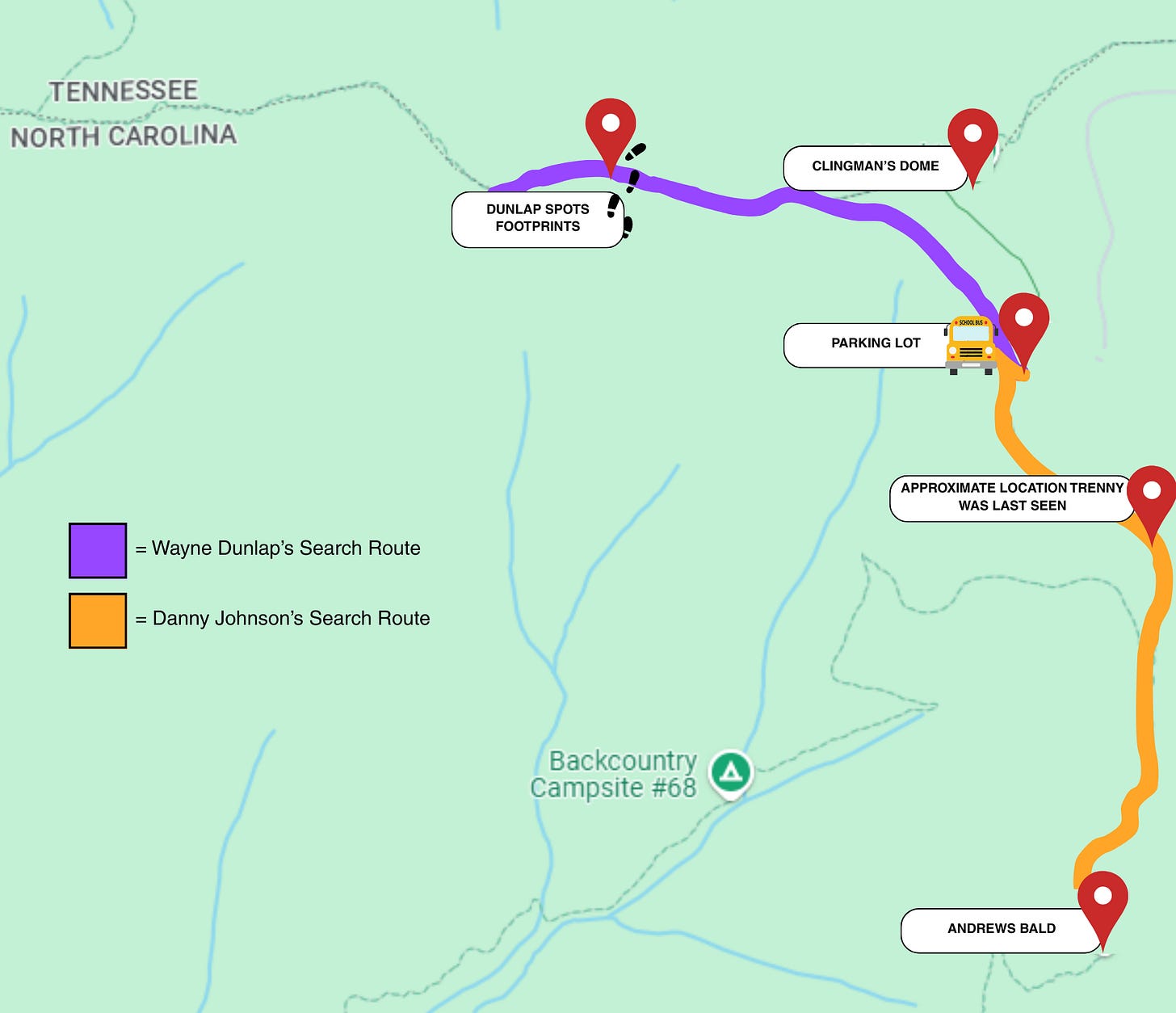 To better help illustrate the scene, I’ve created this beautiful color coded map for you. As you can see, Danny’s search route was the same path the group had traveled earlier that day. Wayne Dunlap walked in the opposite direction towards the Double Spring Gap Shelter which is about three miles from the parking lot.