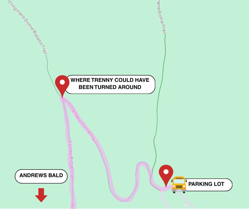 For additional context, the pink highlighted portion of the route is the original trail route the class would have taken to and from the parking lot. If Trenny had not turned onto Clingmans Dome Trail, and continued straight towards the bypass trail, she would have eventually ended up on the Appalachian Trail.