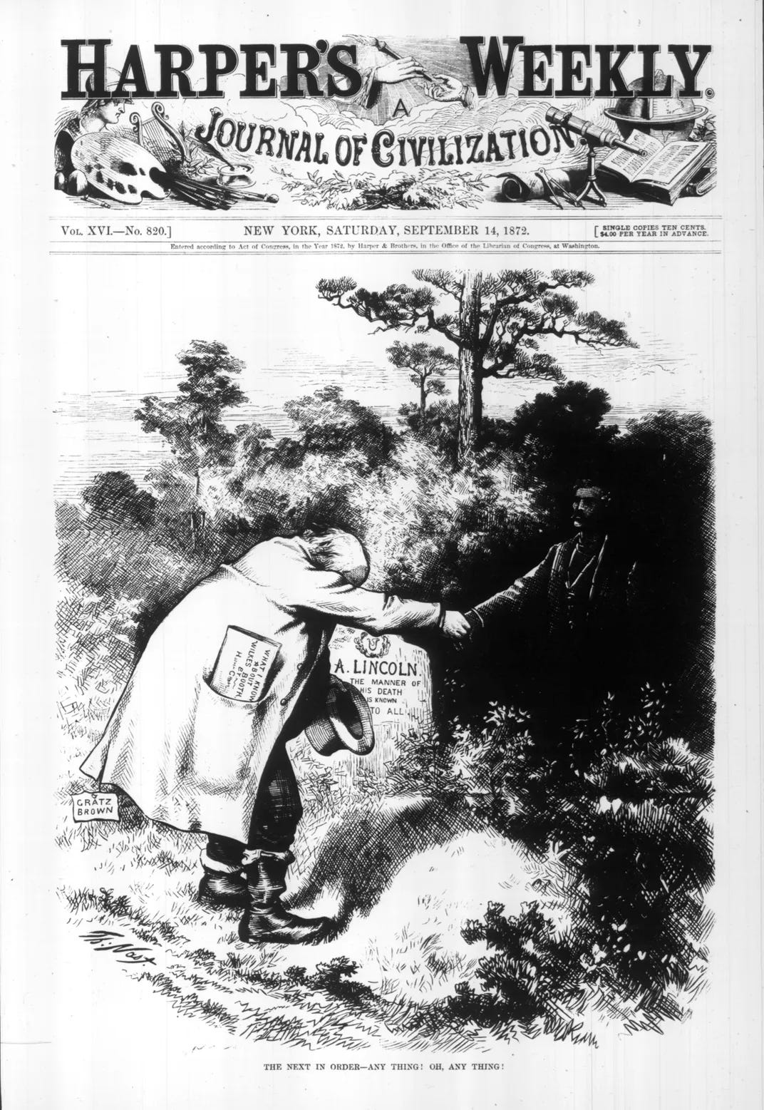And here is perhaps my favorite, an illustration of Greeley shaking hands with John Wilkes-Booth over Lincoln’s grave (1872). I don’t know what drugs Thomas Nast was on, but he was bringing a wildly dark energy to the party, and Harper’s Weekly was apparently cool with that.